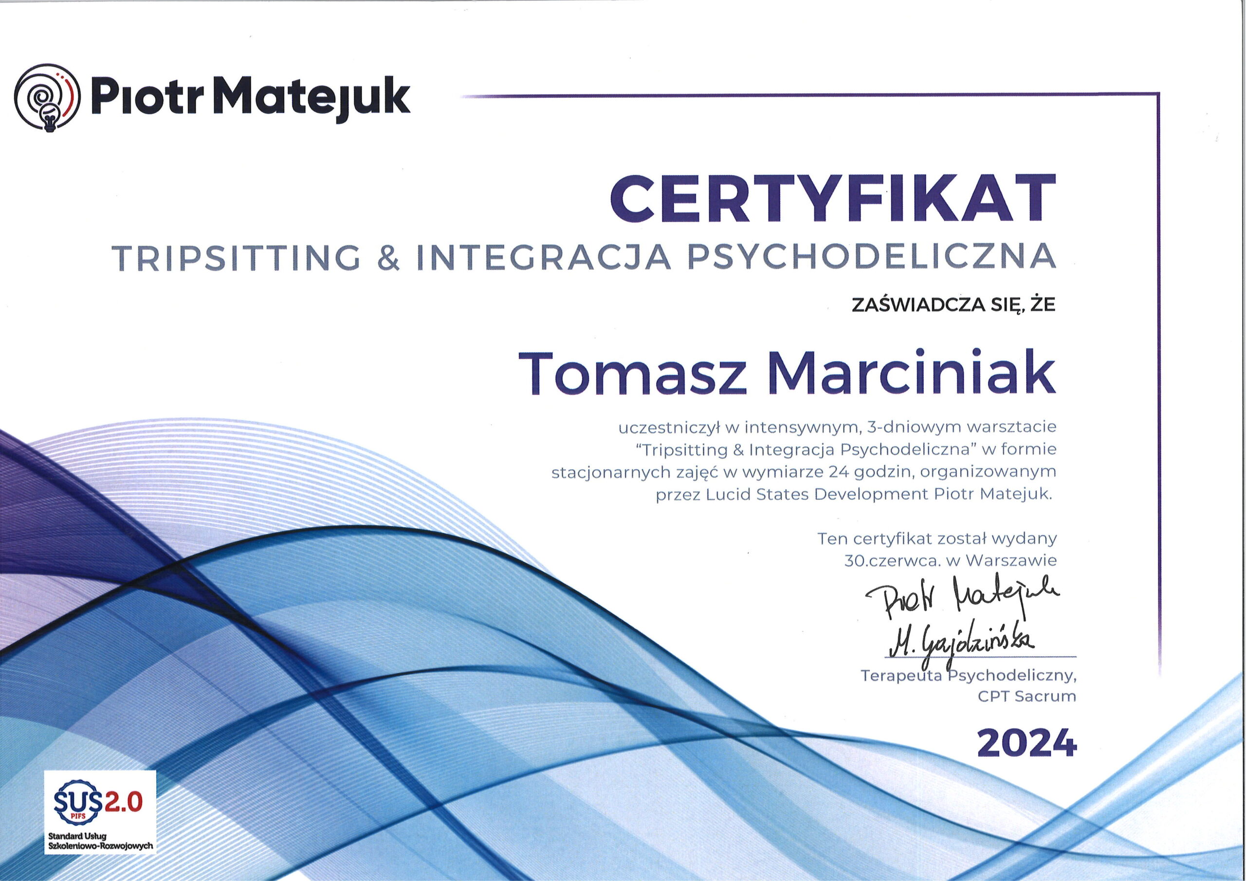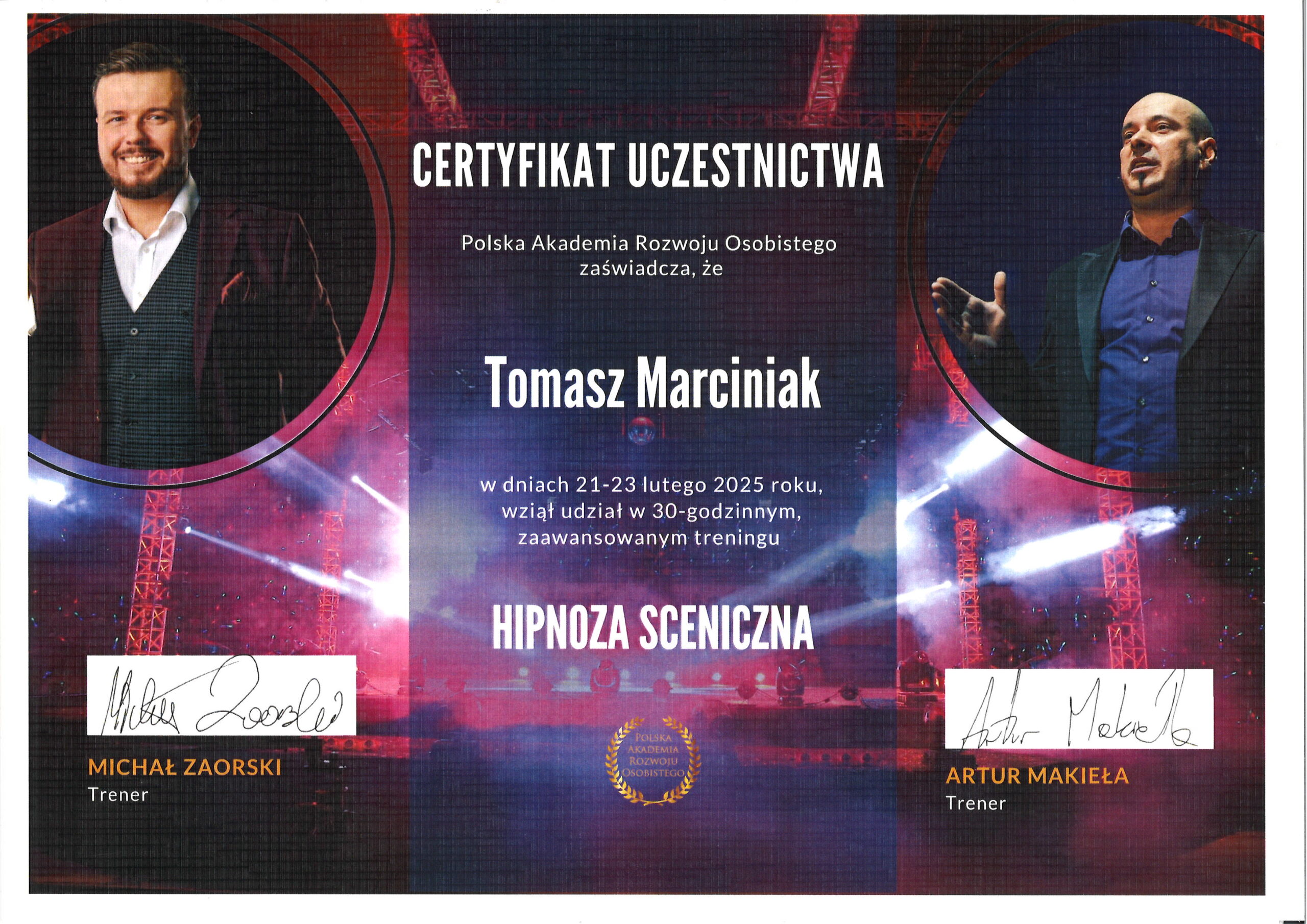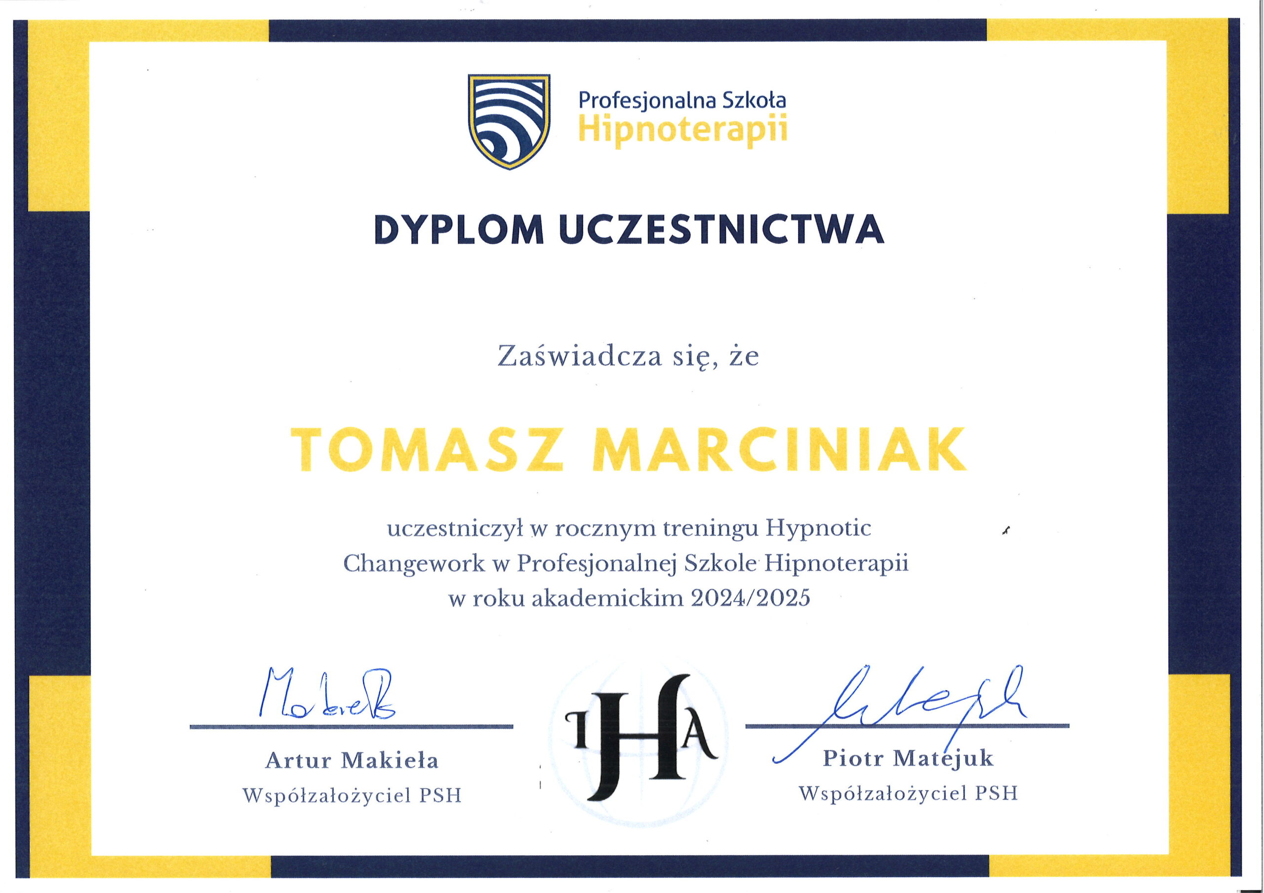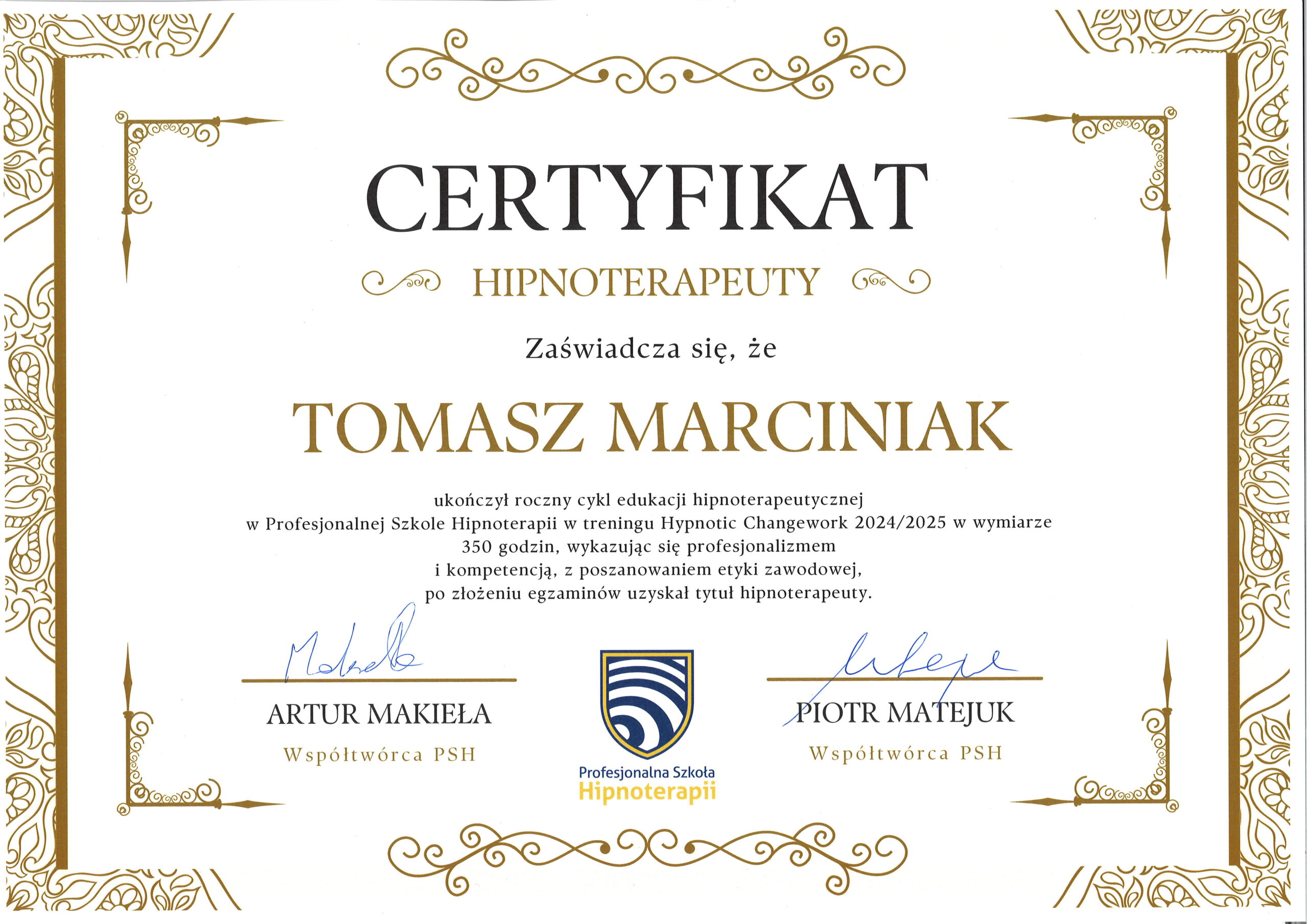 Nazywam się Tomasz Marciniak, jestem przedsiębiorcą, ekonomistą związanym zarządzaniem nieruchomościami i hipnoterapeutą doskonalącym swoje umiejętności w Profesjonalnej Szkole Hipnoterapii, która jako jedyna w kraju posiada certyfikację European Society of Hypnosis.